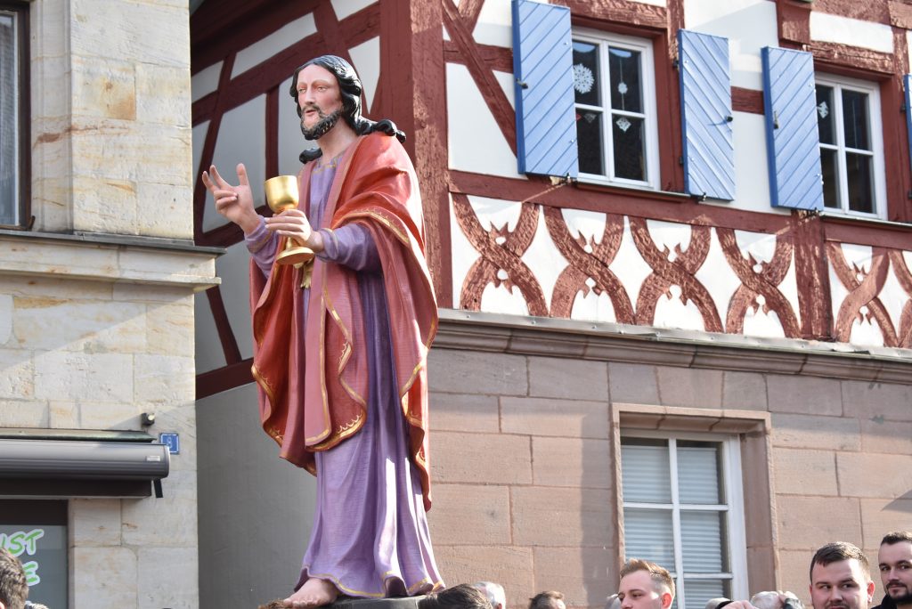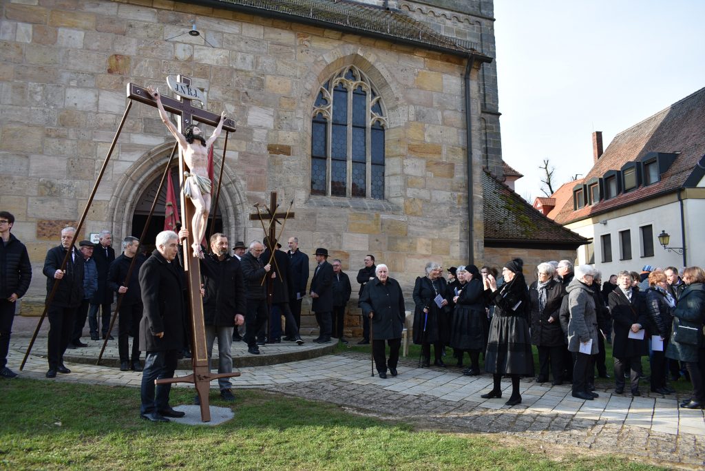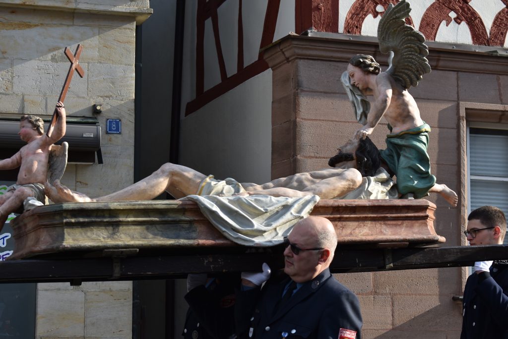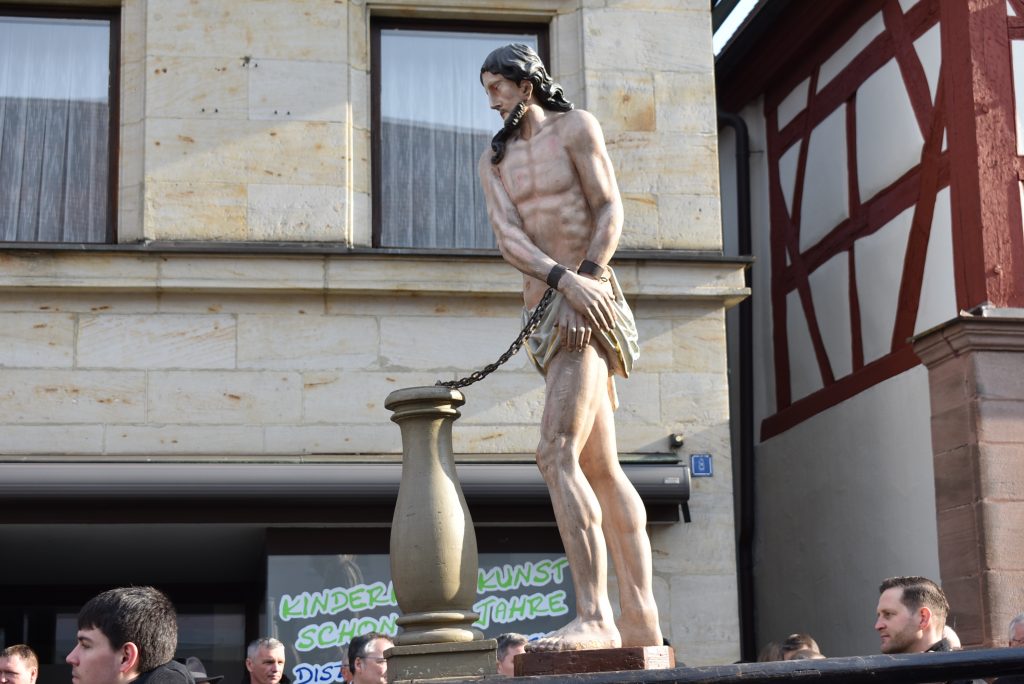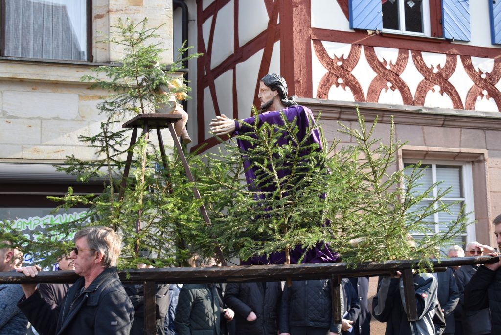 Der Richter der Welt wird vom Menschen gerichtet. Zum Tode verurteilt und ans Kreuz genagelt. Das ist unglaublich. Und doch musste es sein, sonst hätten wir im Kreuz kein Heil. Das ist die Botschaft des Karfreitags. In Neunkirchen am Brand findet dazu jährlich die Prozession mit elf lebensgroßen holzgeschnitzten Figuren statt. Gebetet wird seit den 70er Jahren der Kreuzweg. In den Jahren vorher wurde der schmerzhafte Rosenkranz gebetet. Die Prozession in Neunkirchen am Brand ist neben der in Lohr am Main die einzige in Deutschland mit lebensgroßen Figuren. Und trotzdem gibt es zwischen beiden einen enormen Unterschied: In Neunkirchen am Brand reihen sich die Zuschauer in die Prozession ein und laufen und beten mit. Jedes Jahr kommen -je nach Wetter- zwischen 3000 und 5000 Gläubige in die Marktgemeinde, um an Jesus Leidensweg teilzunehmen. Getragen werden die oft über 100 Kilo schweren Figuren von Männern und Jugendlichen aus den zur Gemeinde gehörenden Ortsteilen. Nur das Hohe Kreuz wird immer von den Zimmermannsleuten getragen. Die Ministranten führen die Prozession an, mit einem Kreuz an dem Jesus Marterwerkzeuge sind. Ein Vorbeter betet die Stationen, die Gläubigen antworten, es wird auch gesungen und dieser Gesang musikalisch durch den Musik- und Trachtenkapelle begleitet. Mit jeder Darstellung des Leidens Christi wächst die Bedeutung von Karfreitag. Wie das Schwert in der Darstellung „Jesus liegt im Schoß seiner Mutter“ sticht es im Herzen der Gläubigen. Für den Menschen hat Jesus all diese Qual und das Leid erduldet. Wozu? Um uns zu retten. Sind wir das wirklich wert, frage ich mich so manches Mal? Gerade wenn man den Alltag, den Krieg nicht nur zwischen Ländern, sondern bereits in der kleinen Gemeinschaft erlebt. Eine Gesellschaft, die immer mehr verroht. Kinder bringen Kinder um. Es wird gemobbt, geneidet und immer mehr egoistisches Verhalten herrscht vor. Wenn sich schon manche Menschen fragen, warum das so ist, was muss sich dann unser Herr denken? Sind wir es also wirklich wert? Offensichtlich, sonst hätte es keinen Karfreitag gegeben und für uns kein Heil durch das Kreuz. Vielleicht sollten wir anfangen, dafür zu danken, indem wir uns gottgefällig verhalten.