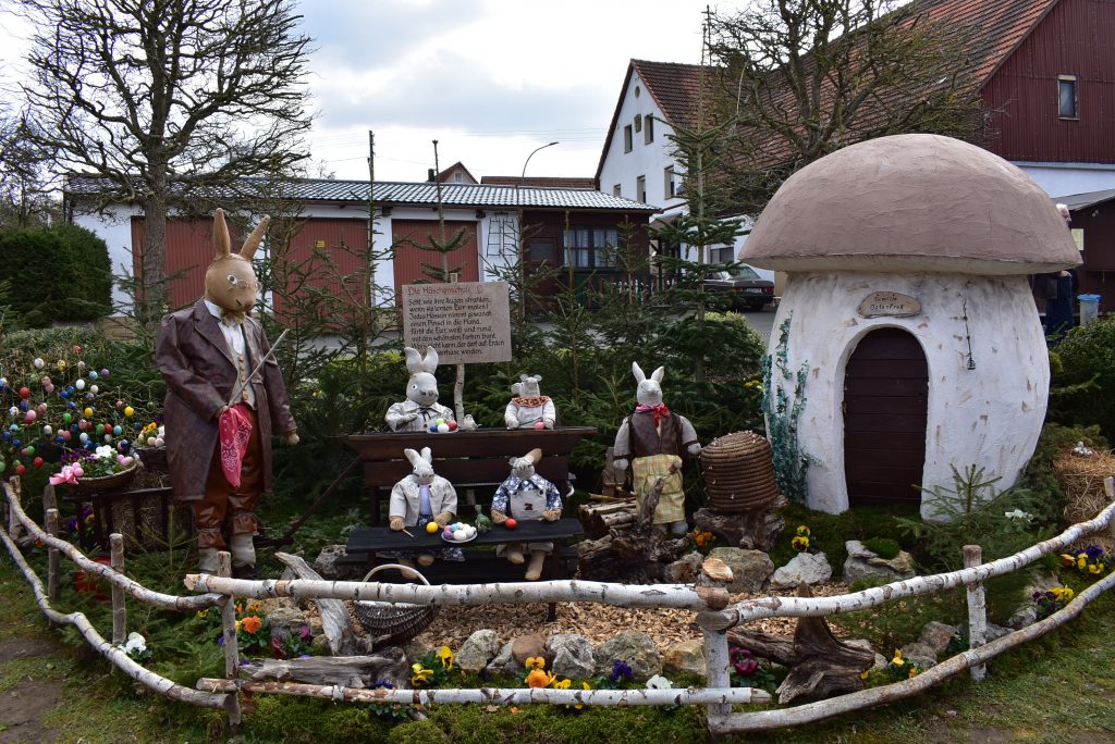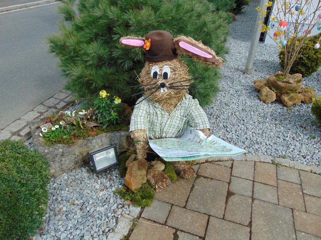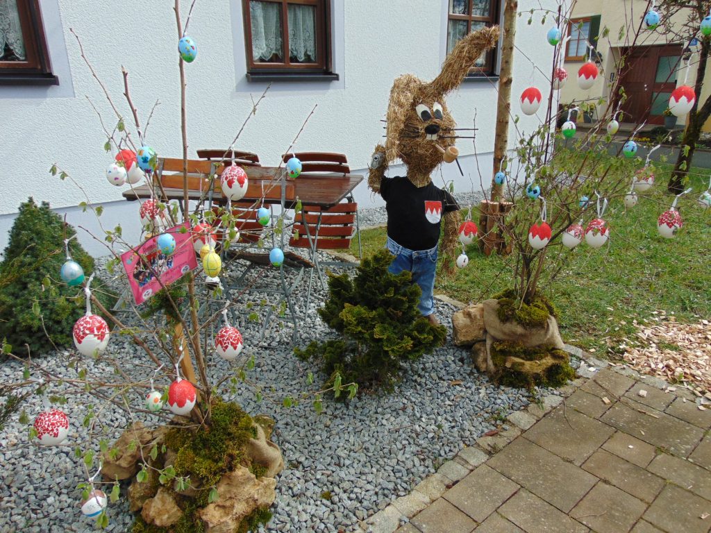 Auch das Umfeld wird in Kleingesee immer passend gestaltet. Ein gemütlich rauchender Hase, mit dem fränksichen Wappen auf dem Shirt, die Eier in den Frankenfarben bemalt.