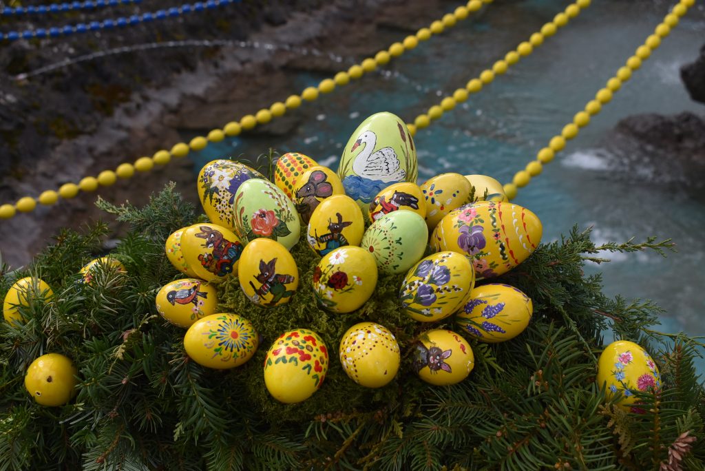 Wasser ist das kostbare Gut. Die Fränkische Schweiz ist als wasserarme Region bekannt. Mühsam war es den Menschen früher Wasser in Eimern zu schleppen, zumal die Landschaft hier recht bergig ist. Die ersten Brunnen erleichterten den Menschen das Leben. Nicht nur deshalb, sondern um das Wasser als kostbares Gut zu ehren, wurden die Brunnen gechmückt. Eine fränkische Tradition. Viele der bemalten Eier haben deshalb die fränkischen Farben Rot und Weiß. Entweder sind die Ostereier ganz in diesen Farben bemalt oder die Grundierung ist Rot und / oder Weiß. Es ist kein Muss. Manche Ostereier sind bunt bemalt, mit Blumen-, Tier- oder christlichen Motiven, manche haben die Bauernmalerei als Maltechnik und wieder andere haben weiße Muster, ähnlich eines Mandalas.