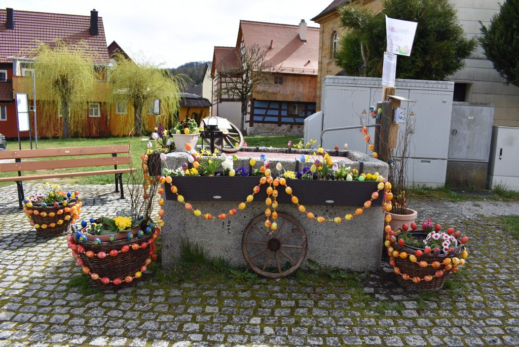 Nach Untertrubach kommt Obertrubach und dieser Ort hat zwei Osterbrunnen. Hier einer davon, der Hauptstraße folgend, kann er gar nicht übersehen werden.