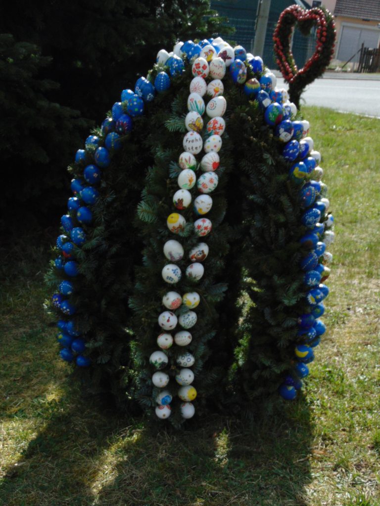 Viele Osterbrunnen haben eine Krone. In der Krone versteckt ist oft ein großes Ei, ein Straußenei. Die Bemalung ist unterschiedlich. Manchmal sind christliche Motive drauf, manche sind einfach farbig bemalt. Hier in Kleingesee ist die Krone passend zum Thema mit Eiern in den Frankenfarben bestückt.