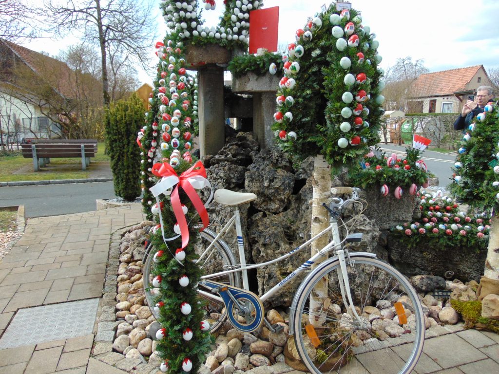 Besonders bekannt geworden ist der Osterbrunnen in Kleingesee. Dort denkt sich die Osterbrunnen-Gruppe jährlich ein neues Thema aus und schmückt die Eier sowie den Platz um den Brunnen herum passend zu dem Thema, das heuer „Fränkische Schweiz“ lautet. Wofür ist die Fränkische Schweiz, abgekürzt FS, bekannt? Man kann hier Wandern, Mountainbiken, Klettern, Kanufahren. Hier auf dem Bild ein Fahrrad, am Brunnen gelehnt. Auf der anderen Seite sind Wanderschuhe und Rucksack…