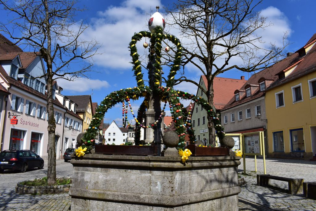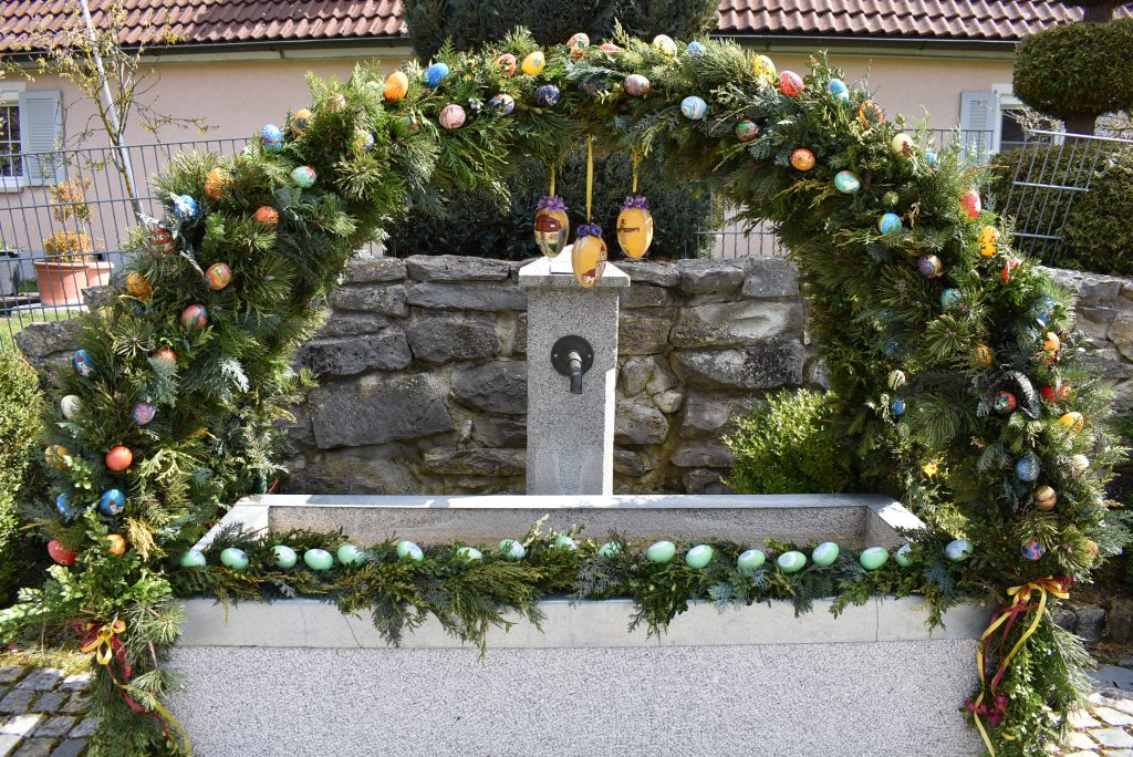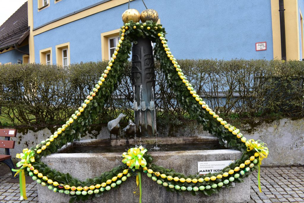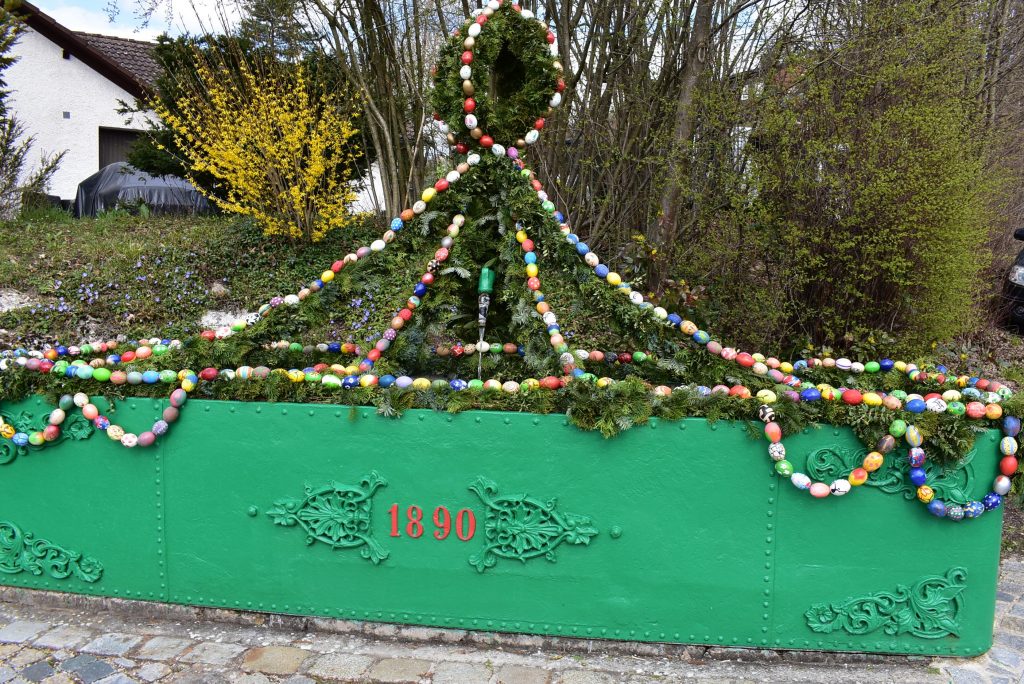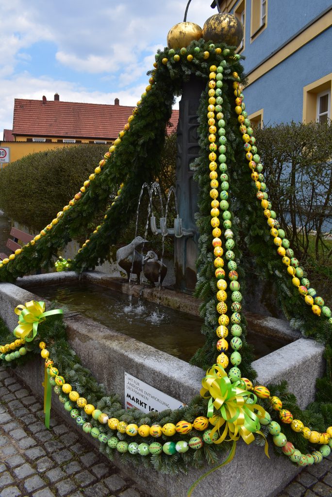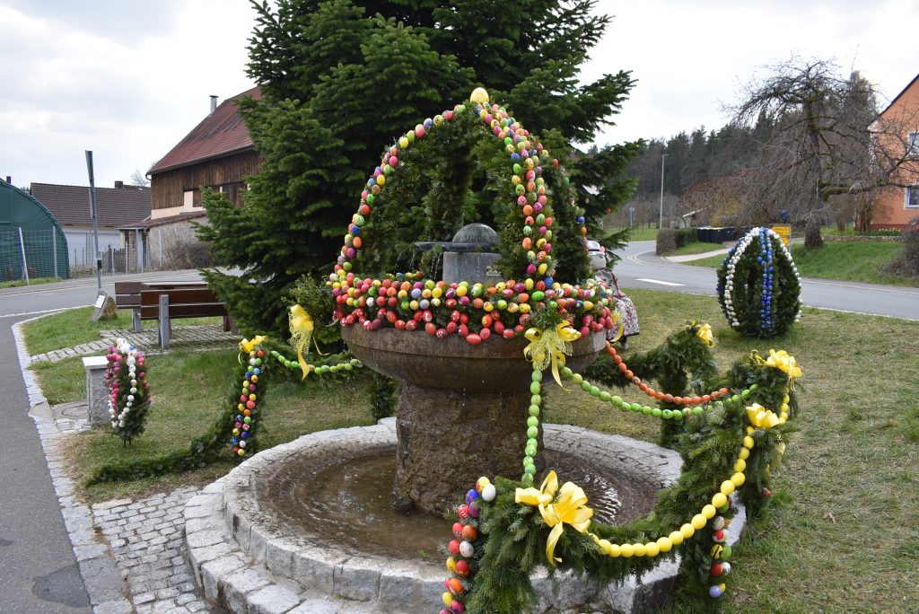 Das Osterbrunnenschmücken ist eine uralte Tradition und ist vor allem in Bayern und hier hauptsächlich in der Fränkischen Schweiz zu finden. Das Dorf kann noch so klein sein, ein geschmückter Osterbrunnen ist oft in der Dorfmitte zu finden. Manche Dörfer haben sogar zwei Osterbrunnen. Der Brunnen war ein lebenswichtiger Teil eines Ortes, damit Menschen und Tiere sauberes Wasser hatten. Wasser überhaupt und sauberes noch dazu, war nicht selbstverständlich und ist es leider in vielen Ländern immer noch nicht. Aus Dankbarkeit wird der Brunnen heute noch an Ostern geschmückt. Wie an den vielen wunderschön geschmückten Osterbrunnen zu erkennen ist, geben sich die Schmückerinnen große Mühe und investieren viel Zeit, um die Eier zu bemalen. Jeder Brunnen ist anders geschmückt. Meist sind es Frauen, die den Brunnen kreativ und ideenreich schmücken. In Kleingesee beispielsweise gibt es jährlich ein anderes Motto. Mal waren es Märchen, dann die Feuerwehr. Nicht nur der Platz vor und um den Brunnen herum ist dann entsprechend geschmückt mit Märchenfiguren aus Stroh gebastelt, auch die Eier tragen Motive passend zum Motto. Andere schmücken immer mit einer traditionellen Farbe. In Igensdorf ist das rot und weiß – die fränkischen Farben- und am kleinen Kirschenbrunnen sind die Eier gelb bemalt. Nicht einfarbig, sondern in den Farbtönen gemustert. Auch Kinder bringen sich ein. So bemalen Kita Kinder Eier und schmücken einen Brunnen wie in Gräfenberg oder hängen die bemalten Eier an einen Baum, wie in Geschwand geschehen. Denn nicht nur der Brunnen, der gesamte Platz um den Brunnen herum ist österlich geschmückt und dekoriert. Auch wenn in vielen Orten Deutschlands geschmückt wird, so sind die meisten doch hier in der Fränkischen.