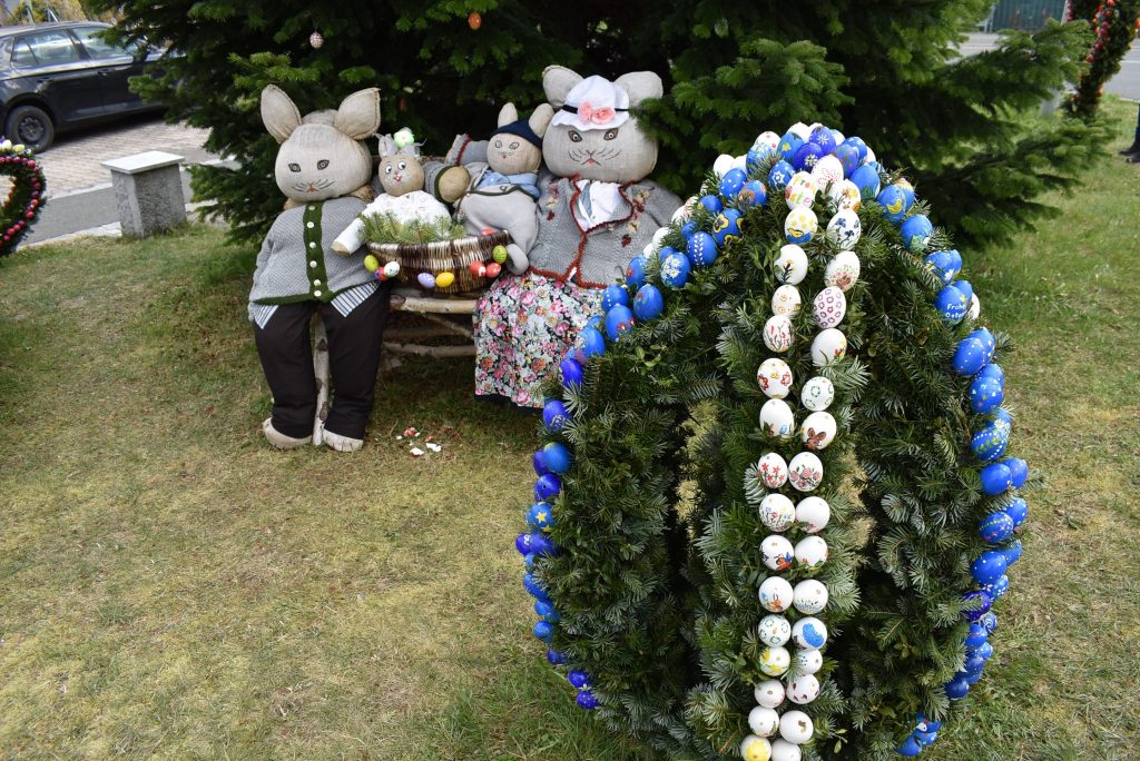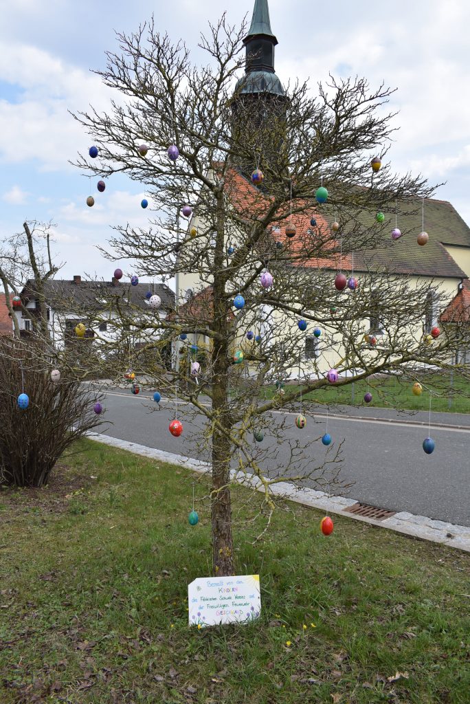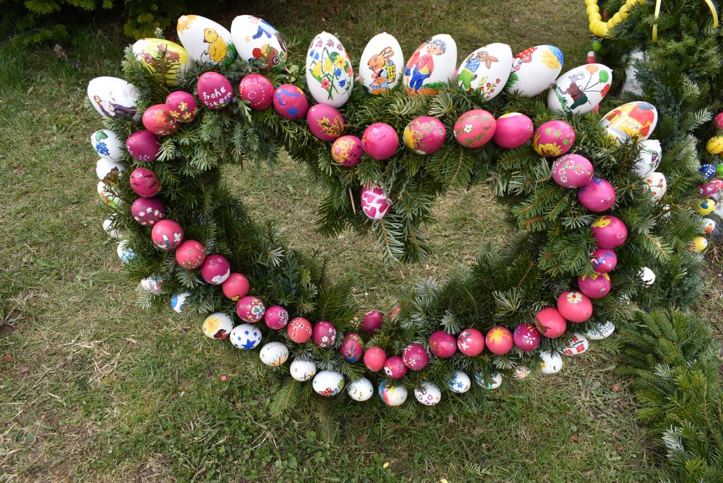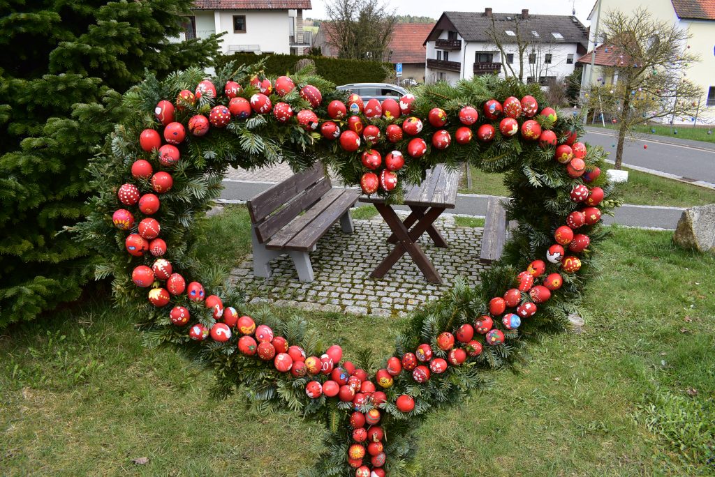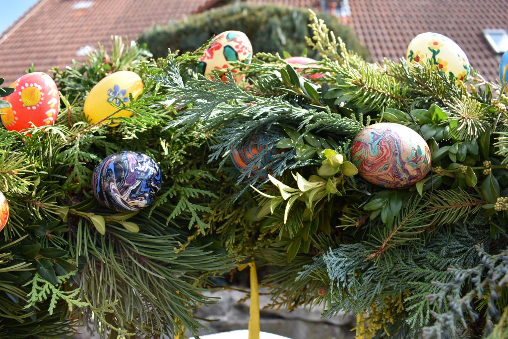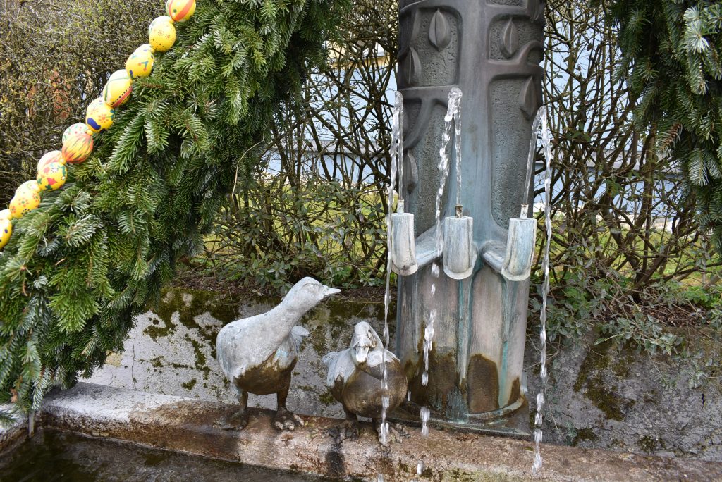 Das Osterbrunnenschmücken ist eine uralte Tradition und ist vor allem in Bayern und hier hauptsächlich in der Fränkischen Schweiz zu finden. Das Dorf kann noch so klein sein, ein geschmückter Osterbrunnen ist oft in der Dorfmitte zu finden. Manche Dörfer haben sogar zwei Osterbrunnen. Der Brunnen war ein lebenswichtiger Teil eines Ortes, damit Menschen und Tiere sauberes Wasser hatten. Wasser überhaupt und sauberes noch dazu, war nicht selbstverständlich und ist es leider in vielen Ländern immer noch nicht. Aus Dankbarkeit wird der Brunnen heute noch an Ostern geschmückt. Wie an den vielen wunderschön geschmückten Osterbrunnen zu erkennen ist, geben sich die Schmückerinnen große Mühe und investieren viel Zeit, um die Eier zu bemalen. Jeder Brunnen ist anders geschmückt. Meist sind es Frauen, die den Brunnen kreativ und ideenreich schmücken. In Kleingesee beispielsweise gibt es jährlich ein anderes Motto. Mal waren es Märchen, dann die Feuerwehr. Nicht nur der Platz vor und um den Brunnen herum ist dann entsprechend geschmückt mit Märchenfiguren aus Stroh gebastelt, auch die Eier tragen Motive passend zum Motto. Andere schmücken immer mit einer traditionellen Farbe. In Igensdorf ist das rot und weiß – die fränkischen Farben- und am kleinen Kirschenbrunnen sind die Eier gelb bemalt. Nicht einfarbig, sondern in den Farbtönen gemustert. Auch Kinder bringen sich ein. So bemalen Kita Kinder Eier und schmücken einen Brunnen wie in Gräfenberg oder hängen die bemalten Eier an einen Baum, wie in Geschwand geschehen. Denn nicht nur der Brunnen, der gesamte Platz um den Brunnen herum ist österlich geschmückt und dekoriert. Auch wenn in vielen Orten Deutschlands geschmückt wird, so sind die meisten doch hier in der Fränkischen.