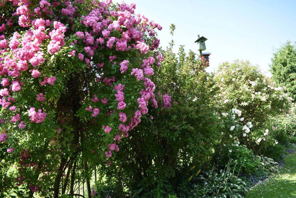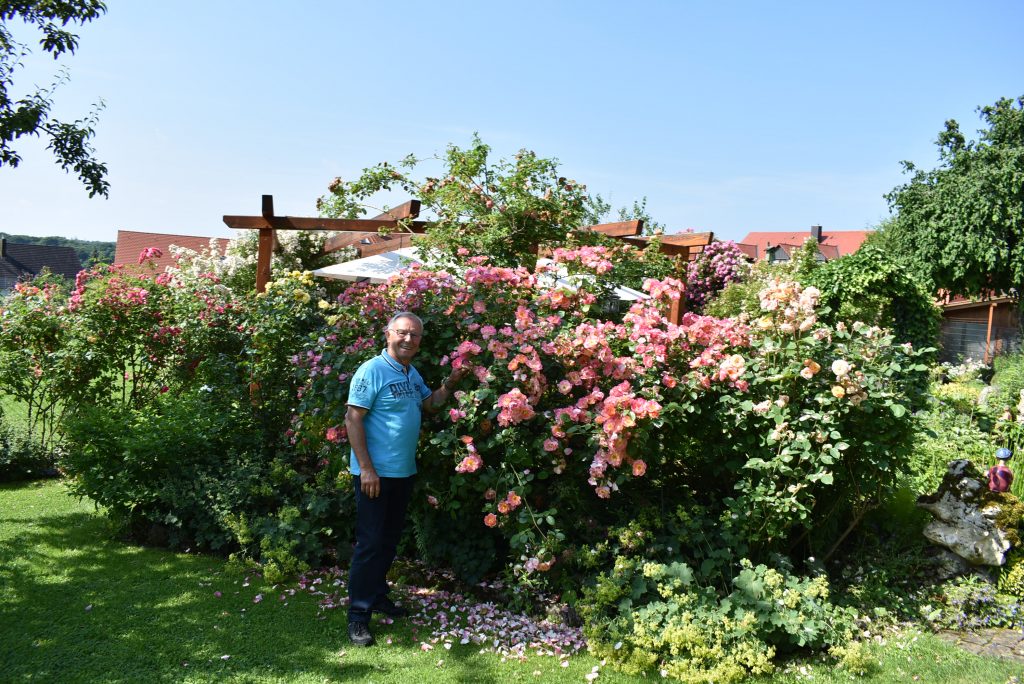 In jedem Baumarkt gibt es Naturdünger für Rosen, die selbst wenn sie nicht in die Erde geharkt werden, unschädlich für Hühner und Vögel sind, sollten diese daran picken. Grundsätzlich müssen Rosen nicht gegossen werden. Das liegt an ihren tiefgreifenden Wurzeln. Nur im ersten Jahr nach der Anpflanzung darf leicht mit Wasser gearbeitet werden. Rosen sind nicht nur hübsch anzusehen, sondern robust und langlebig. „Sie ist die Blume, die am längsten blüht“, sagt Eichler. Damit sich dieses Blütenmeer jährlich wiederholt, müssen verblühte Rosenköpfe geschnitten werden, aber richtig. Man sucht an dem Stil mit dem verblühten Kopf den Blattaustrieb, der fünf Blätter besitzt. Kurz oberhalb dieses bestimmten Blattaustriebs wird die Rose abgeschnitten. Ein weiterer beliebter Fehler ist der Herbstschnitt. Das kann ebenso ein Grund sein, dass die Rose im nächsten Jahr nur zögernd und kümmerlich blüht. Deshalb: „Die Rosen nie im Herbst schneiden“, sagt Eichler. Denn meist bekommt die Pflanze noch einen kleinen Schub und treibt aus. Im Winter erfriert sie dann. Schneidet man hingegen die verblühten Köpfe wie erläutert, braucht die Königin der Blumen auch keinen Wintermantel. Locken im Frühjahr die ersten Sonnenstrahlen den Gärtner und die Blumenköpfe hinaus, darf er gerne Hand anlegen. „Im Frühjahr dar die Rose lieber zu viel als zu wenig geschnitten werden. Die Rose verträgt einen kräftigen Rückschnitt“, beteuert Eichler. Die blühende Rosenvielfalt in seinem Garten ist Zeuge davon wie gut seine Ratschläge funktionieren.