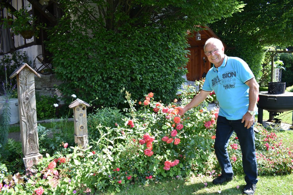 Sei wie das Veilchen im Moose, sittsam, bescheiden und rein. Nicht wie die stolze Rose, die immer bewundert will sein. Zumindest die Ü-45 Jährigen kennen diesen Spruch aus dem Poesiealbum. Doch ist es so? Will die Rose bewundert werden und ist sie tatsächlich stolz? Günther Eichler, LBV Mitglied und Besitzer von 180 Rosen aus 115 verschiedenen Sorten in seinem Garten lacht. „Stolz ist vielleicht der Gärtner auf seine Rosen“, meint Eichler. Immerhin spricht man über die Königin der Blumen – deshalb auch die Blume, die der Muttergottes zugeschrieben wird – weil sie so edel aussehen. Und überhaupt: „Wer will nicht bewundert werden?“, meint Eichler. Es ist nicht nur das schöne Äußere, das an der Rose fasziniert, sondern vor allem die Non-verbalen Botschaften, die mit der Rose, je nach Farbe, überbracht werden. Nicht zuletzt deshalb gilt die Rose als beliebteste Schnittblume in Deutschland und erzählt dem Beschenkten ein „Ich liebe dich“ bis hin zu „Vielen Dank“. Die Rose ist Symbol für die Romantik, für die Treue, für Reinheit und Unschuld. Über Jahrhunderte war die Rosenzucht eher Zufall. Richtig intensiv und absichtlich beschäftigte man sich erst Anfang des 19. Jahrhundert mit der Züchtung der edlen Blume. Zunächst in Frankreich. 1795 wird die erste Rosenzüchtung in Deutschland vermerkt. Inzwischen gibt es über 30 000 verschiedene Sorten Rosen. Zwergrosen, Beetrosen, Edelrosen, Buschrosen, Strauchrosen, Kletterrosen, Ramblerrosen, Wildrosen, Bodendeckerrosen und noch mehr. Zum Blickfang im Garten wird die Rose, galt aber als wenig bienenfreundlich. Günther Eichler schüttelt den Kopf. Bienenunfreundlich sind nur die dicht gefüllten Rosen. Rosen, die viele eng aneinander liegenden Bendale aufweisen. Eine Rosenblüte nach der anderen. Da haben es die Insekten schwer, in die Blüte zu krabbeln. Aber: „Es gibt sehr viele bienen- und insektenfreundliche Rosen“, sagt Eichler.